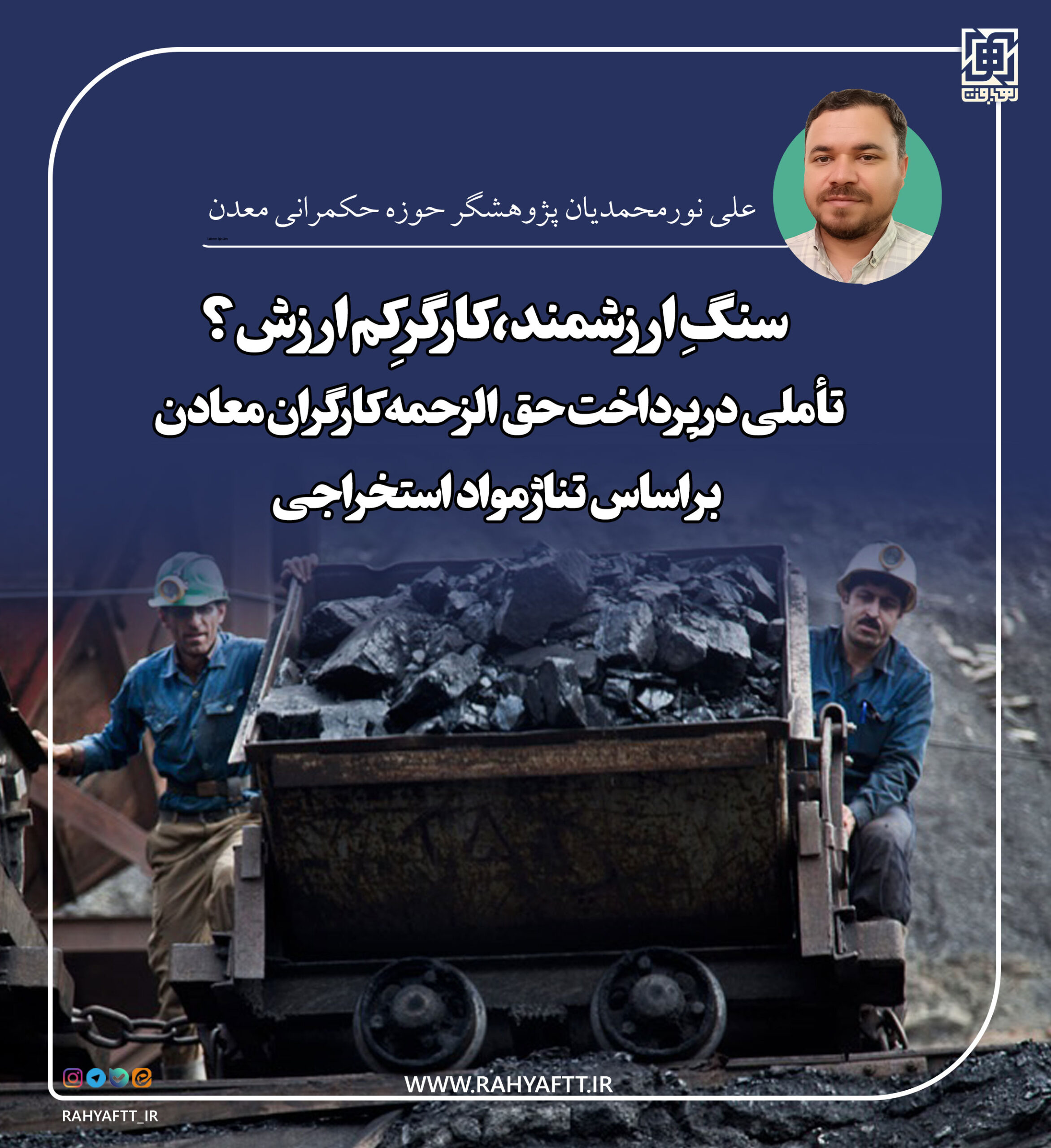 کار در معدن، کاری سخت و خطرناک است اما برای اقتصاد کشور حیاتی است؛ نیروی کار در این بخش باید نه به عنوان ابزار تولید، بلکه به عنوان سرمایه انسانی دیده شود. برقراری نظام مزدی منصفانه، مبتنی بر زمان کاری، مهارت و رعایت ایمنی، تنها شیوهای است که میتواند هم بهرهوری واقعی و هم کرامت انسانی کارگران معدن را تضمین کند.